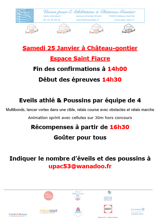 Le samedi 25 janv. 2025 de 14h à 17h Lieu : Espace Saint Fiacre 53200 chateau gontier
