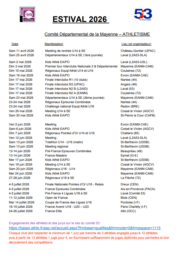 CALENDRIER DES COMPÉTITIONS PISTE