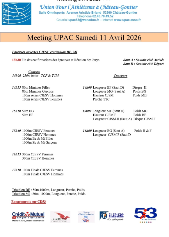 Lieu : stade d'athlétisme 53200 CHATEAU GONTIER